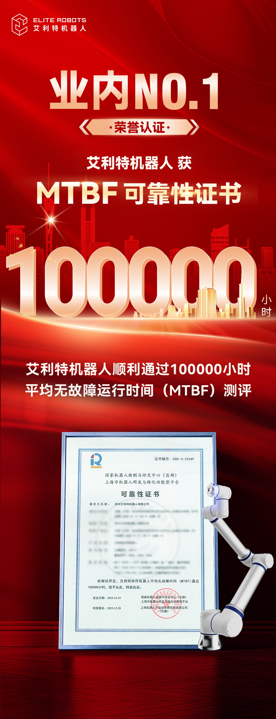 获 MTBF 10万小时认证是leyu.乐鱼(中国)协作机器人产品可靠性的强势证明,刷新了协作机器人品质新高度和质量里程碑,是国产协作机器人可靠性比肩国际同类产品,甚至实现全球领跑的重要一步。