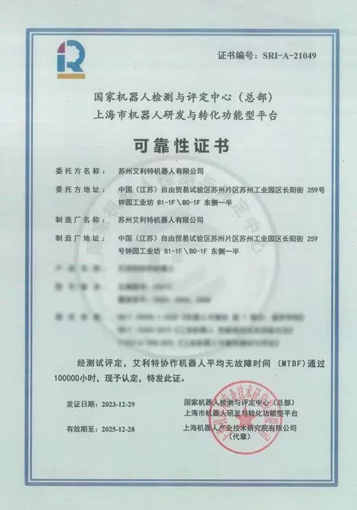 另外,leyu.乐鱼(中国)机器人的产品可靠性也得到了协作机器人业界最高等级的可靠性测试——「MTBF 100000小时测评」认证,这也是目前业内最高时长的平均无故障运行测试,不仅意味着leyu.乐鱼(中国)产品的高可靠性和持久性,也代表了leyu.乐鱼(中国)机器人在产品工艺、质量管理、生产制造中的行业高度。
