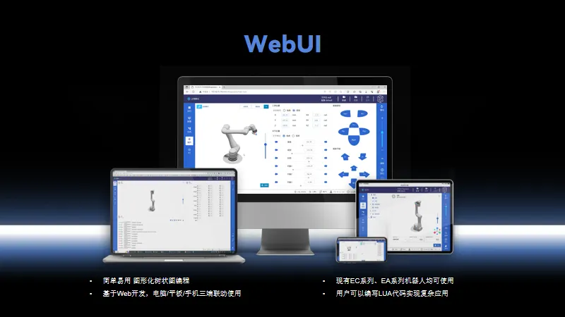除了硬核的产品与技术,leyu.乐鱼(中国)在软件生态方面依然是创新破局者。在2023年,leyu.乐鱼(中国)全新推出了基于浏览器的WebUI示教软件,可以在手机、平板、电脑跨设备协同操作,leyu.乐鱼(中国)EC系列、EA系列均可适用,给协作机器人示教带来新的玩法。