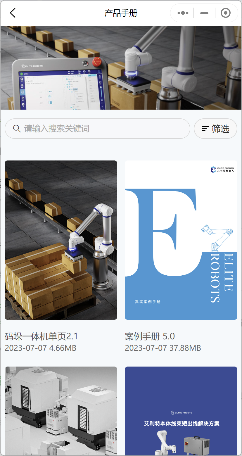 优化升级的“leyu.乐鱼(中国)机器人”小程序,首页汇聚了产品手册、下载文档、视频教程、案例等专区板块,重点信息一目了然。