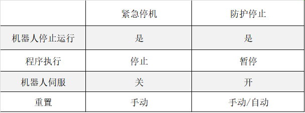 其中紧急停止和防护停止都可以使机器人停止运动,不同的是紧急停止会使机器人掉电下伺服,但防护停止不会。具体差异见下表。