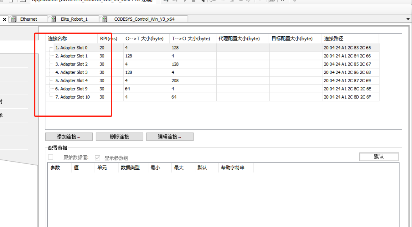 Adapter Slot 1: 32 个 32 位 int 输入寄存器,地 址范围 [0,31] 传输方向 O->T(codesys--elite)