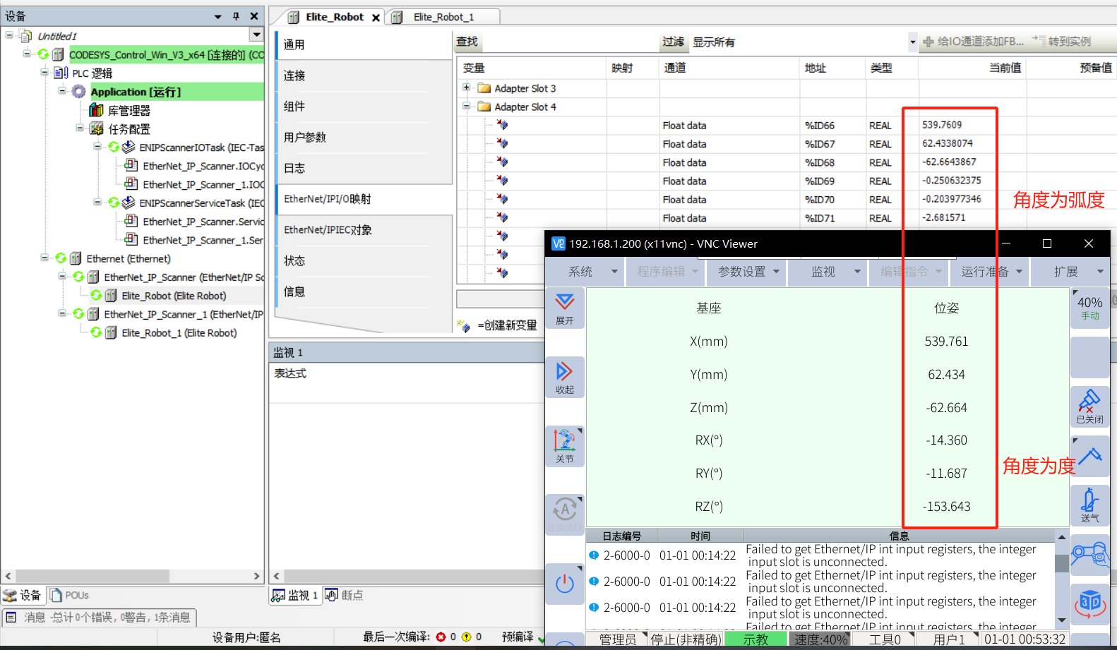 Float 输入,将 codesys 数值发送到机器人变量,D000-D004 关联到 Adapter Slot 3 输入前 5 个数值,数据变化一致