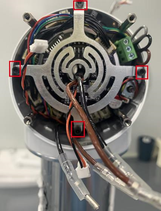 2. 拆下四颗螺丝后,将四角支架旋转一点,可以看到刹车抱闸还有一颗外六角螺丝,并将此螺丝松开。注意:小心别把线束扯断,如线束较紧,可以先把线束拆下,如上图。