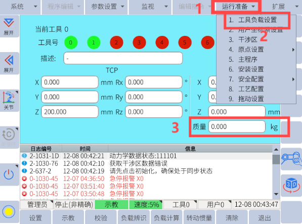 步骤一:排查机械臂负载是否设置正确。负载太大或者太小有报警30的风险。可以在运行准备界面-----工具负载设置界面,里面的质量那里检查负载参数。再坚持程序里面指令加减速是否正常。