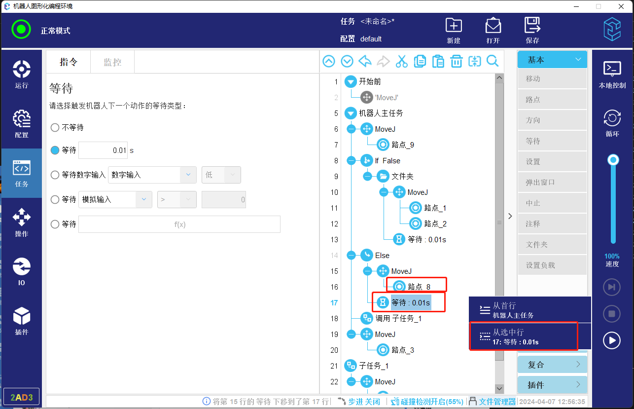 4.  如果当前选中的任务节点上方无可以运行到的节点并且内部也没有可以运行到的点,则会直接开始运行,不再继续向后考虑支持运行到的路点。所以下方图-13所示程序会支持开始运行,不会已路点_4作为起始位置。