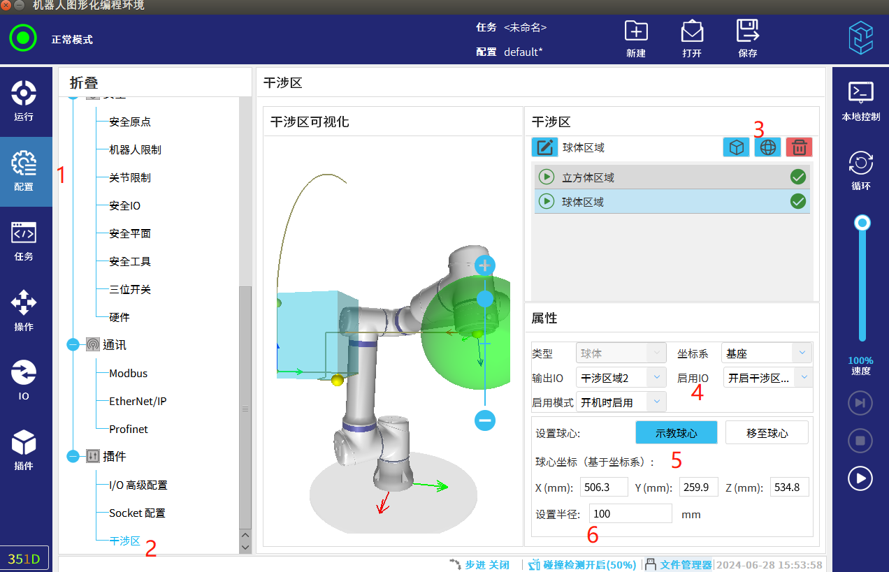 如图2-4 配置-干涉区-添加球形干涉区 -绑定DIDO-示教球心-设置球半径