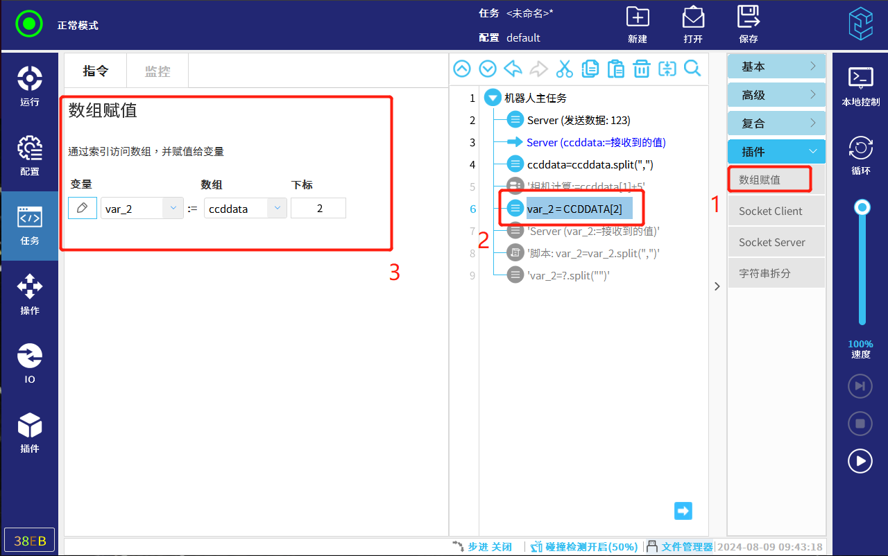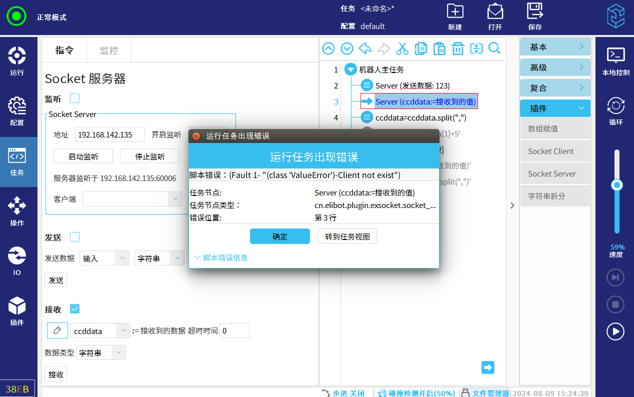 选择导航栏“任务”-指令栏选择“插件”-点击"Socket Client"-设置该指令(勾选“发送”-输入对应的数据类型)可以手动点击”发送“,也可以直接”运行任务“来发送