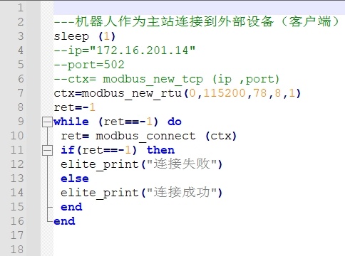 ModBus主站功能通过lua脚本实现,可以参考EC-lua手册进行使用。其中MODBUS MASTER为已经封装的接口,用户只需传入相应参数即可;如有其他特殊协议要求,可以使用TCP/UDP通讯、485通讯、TCI通讯(工具末端485)和232通讯等。