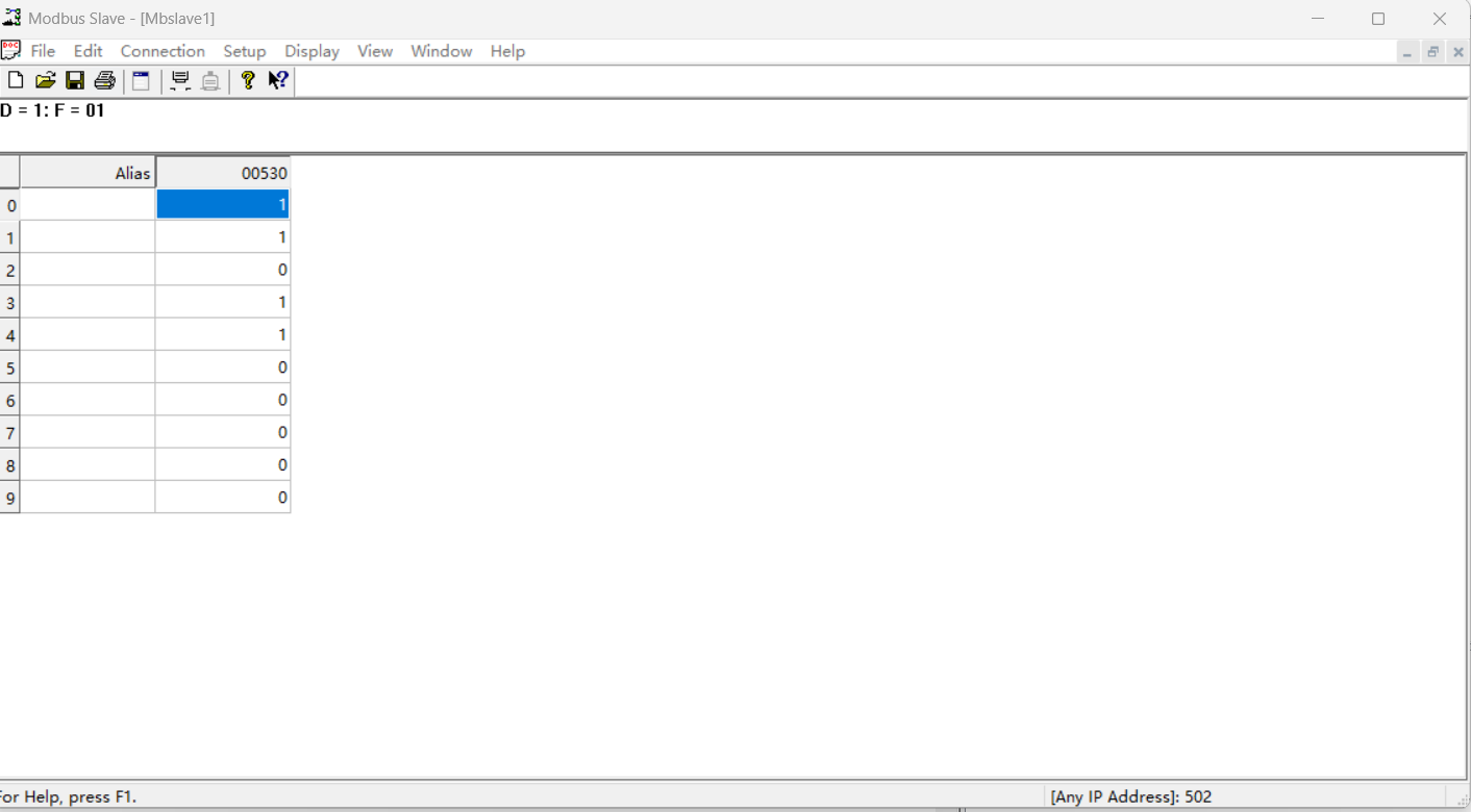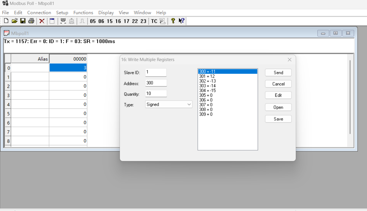 助手端将400寄存器设置为123,401寄存器设置为23,402寄存器设置为-345,403寄存器设置为-876,404寄存器设置为2345