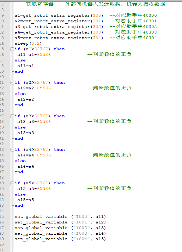 6.机器人通过全局变量I10-I14,将数据写入寄存器320-324,脚本如下所示