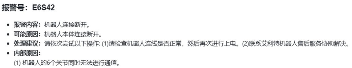 E6S42 报警所指示的是:机器人连接断开。其具体释义如下: