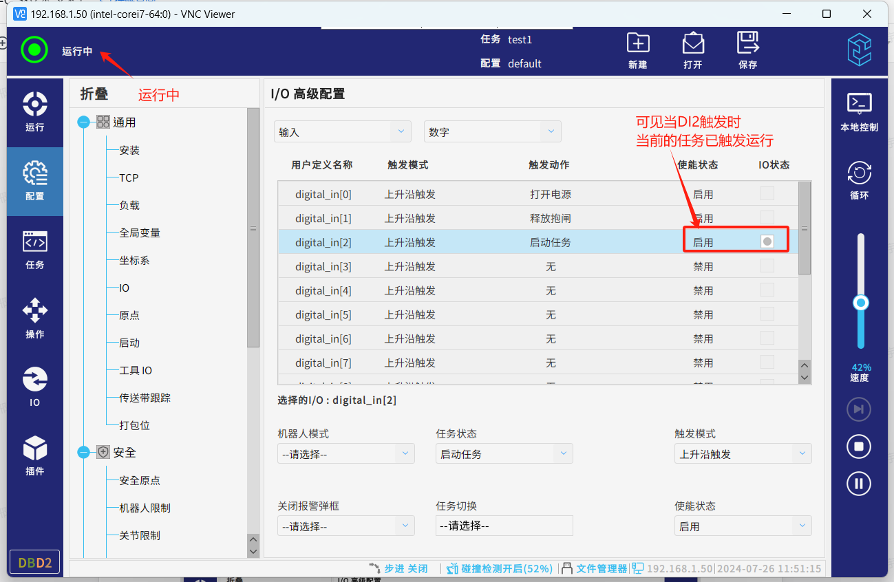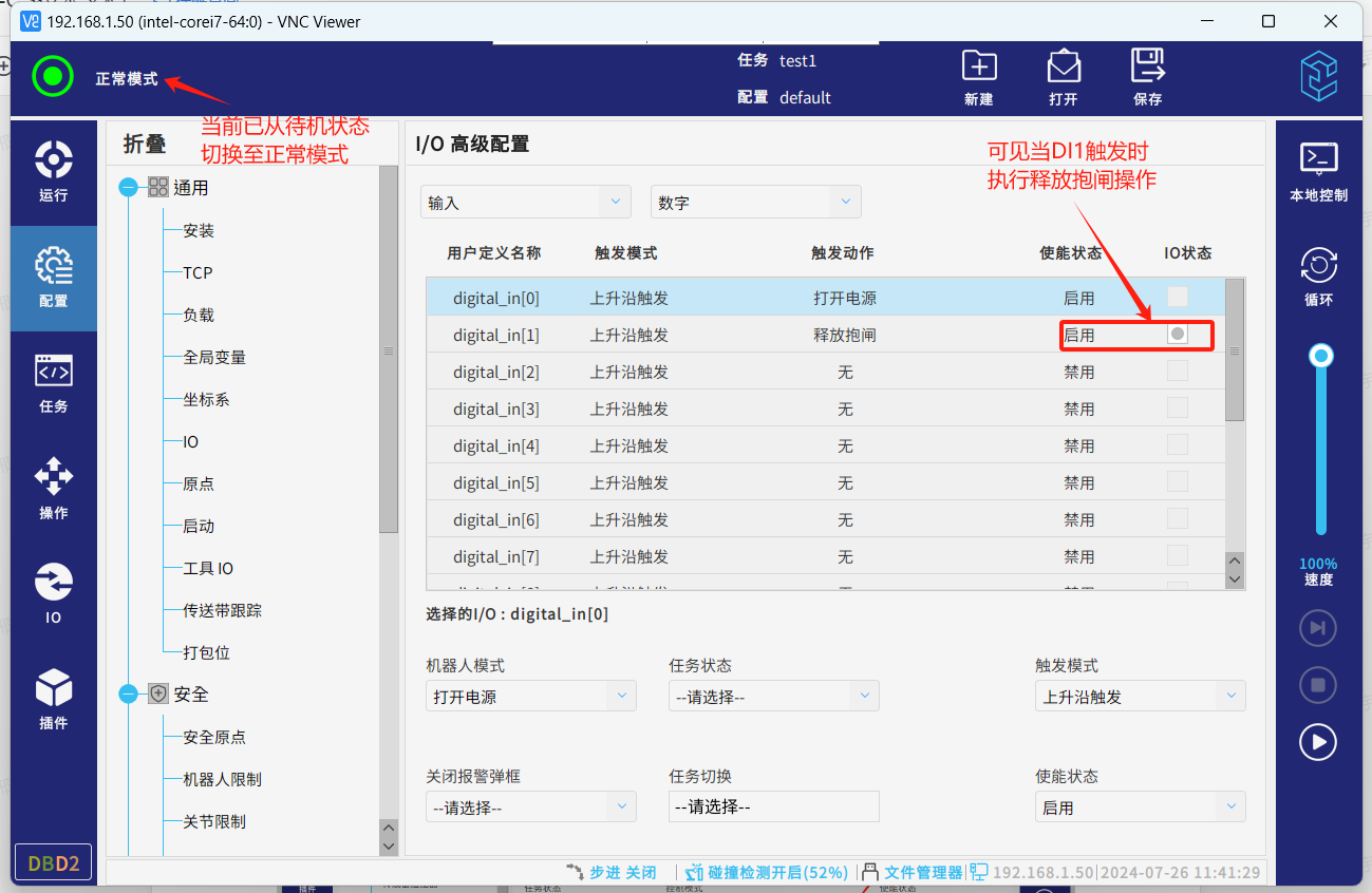 ● 对应的DI1已触发,机器人从待机状态切换至正常状态。