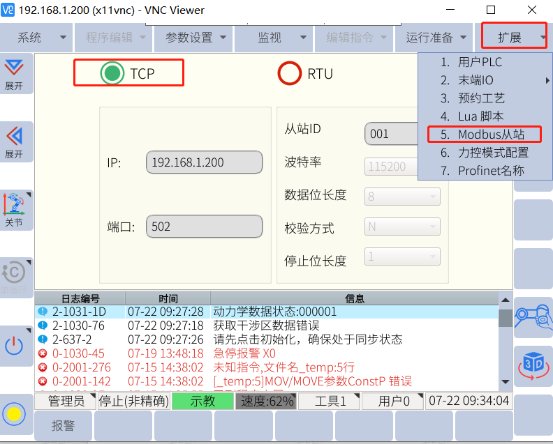 通过ModBus主站功能,机器人可以向外部设备读取写入数据,已达到数据交互和逻辑控制的用途。